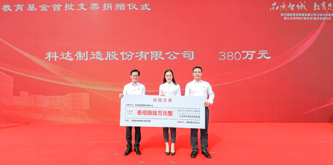 2021年3月30日,由陳村鎮政府投入7億元建設的三龍灣學校(暫定名),在佛山三龍灣核心區域——陳村潭洲正式啟動建設??七_制造作為熱心公益事業、心系陳村教育的企業,當天由公司總裁辦主任饒瓊代表公司捐贈380萬元以支持陳村鎮教育事業的發展。