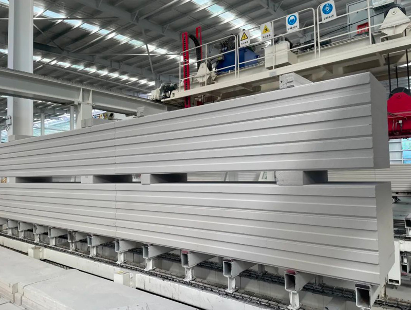 國內首推的濕式分掰+臥式蒸養工藝增加了坯體與蒸汽接觸的面積,有利于板材間蒸汽滲透,熱傳導效率高、蒸養效果好,極大的降低了生產能耗。全新切割系統配備自動旋轉刨槽裝置,自動更換刀具,大大提升板材切割效率。