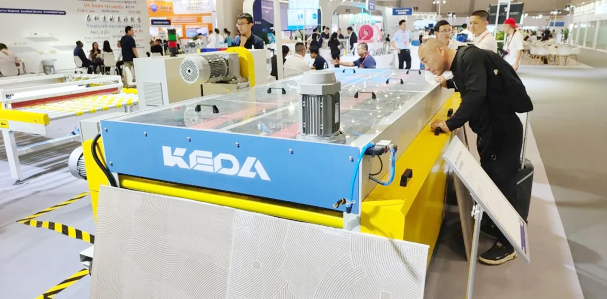 科達的新一代擎系列高效智能磨邊機,其工作寬度涵蓋150-3600mm,磚坯加工厚度從3mm到40mm;推磚速度超過了100片/分鐘,對角線誤差≤0.3mm(以400×800mm為例);還應用了集成磨削量測量、AI算法技術及直驅節電技術,使得磨邊精度高,產品優等率達99.7%以上。