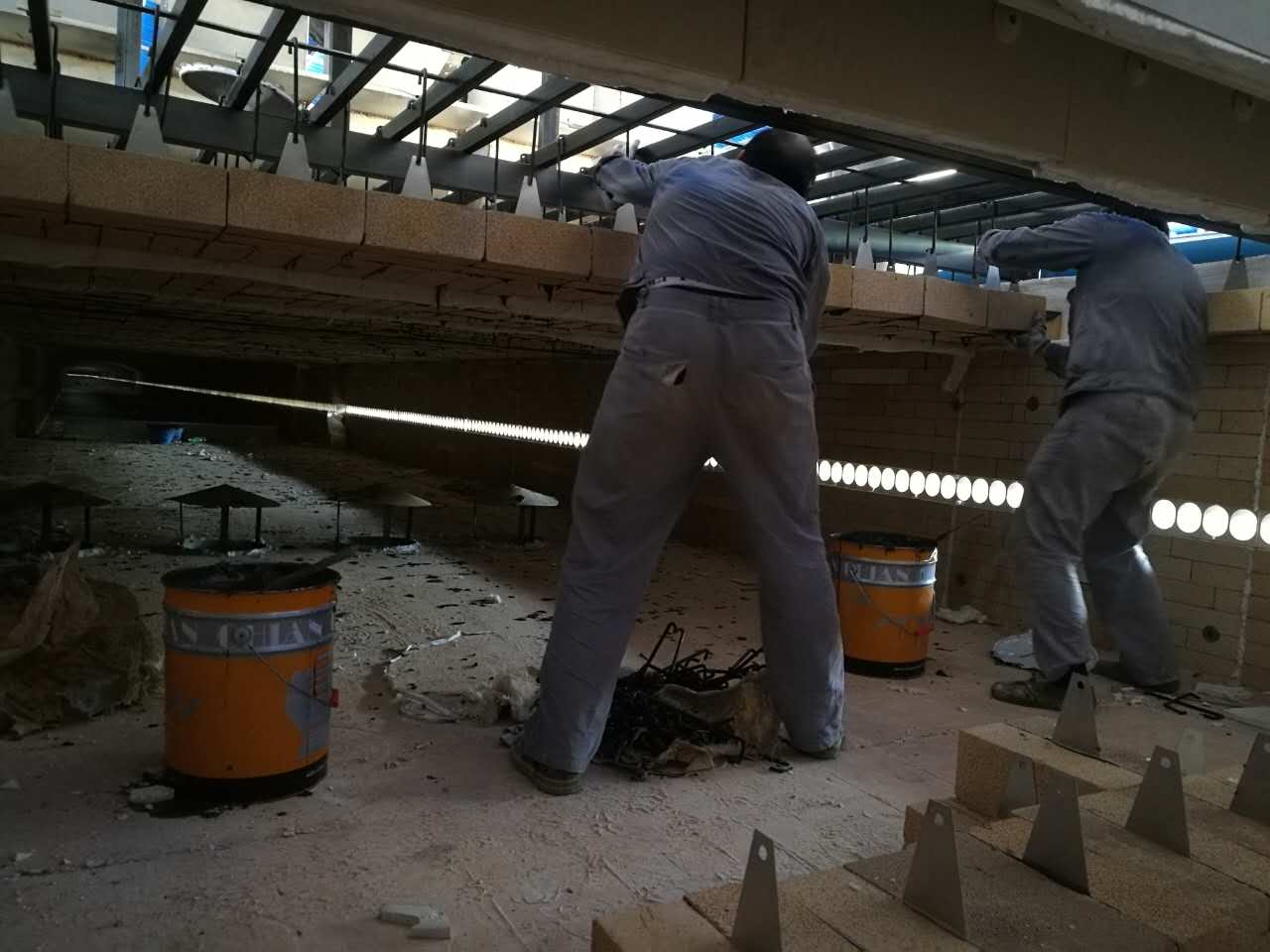 整個(gè)項(xiàng)目時(shí)間緊、任務(wù)重。比起其他項(xiàng)目,該項(xiàng)目很多東西都要發(fā)往現(xiàn)場(chǎng)再制作,而當(dāng)?shù)丶夹g(shù)力量相當(dāng)薄弱,就連焊工與電工都請(qǐng)不到,這給他們的工作帶來(lái)了極大的困擾。在這樣的情況下,員工們都沒(méi)有休息,只有加班加點(diǎn)地焊接窯架、風(fēng)管,放線接線。現(xiàn)場(chǎng)需要補(bǔ)發(fā)物料也是一個(gè)非常棘手的問(wèn)題,例如油漆與保溫材料的運(yùn)輸,對(duì)于公司而言就是一個(gè)不小的挑戰(zhàn)。當(dāng)?shù)氐臈l件也非常差,十幾個(gè)人擠在一間小板房?jī)?nèi),睡眠質(zhì)量也得不到保障,而且時(shí)常還面臨停水的困境。