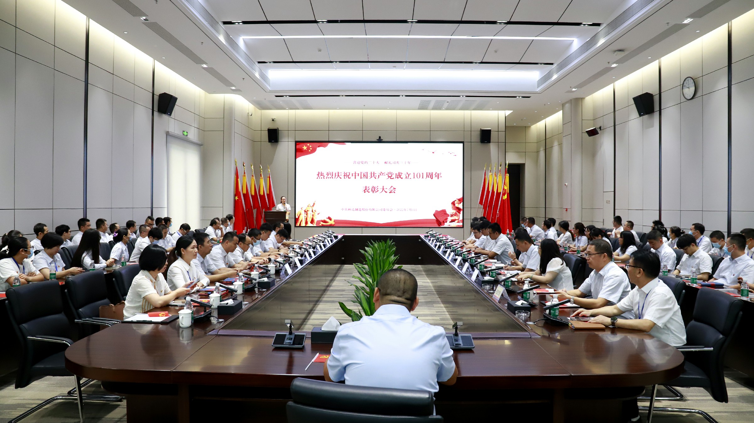 7月1日,科達制造在總部101會議室召開喜迎黨的二十大暨2022年“七一”表彰大會。公司董事長邊程,黨委書記李斌,黨委副書記饒瓊,科達黨委第一、二、三、四支部,恒力泰黨總支書記、黨員,受表彰的先進集體和先進個人代表,以及入黨積極分子等近100人出席了大會。