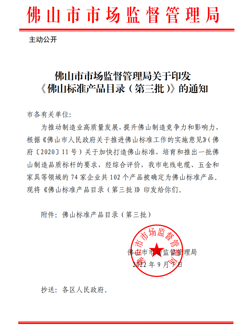 佛山標準是代表佛山制造先進質量和技術水平的系列標準,是市場主體主導制定、權威技術機構評估、政府部門采信的先進團體標準。佛山標準高于國家、行業標準又符合產業實際,并以先進標準為前提,從標準、質量、創新、品牌、效益、社會責任6個維度,對佛山標準產品進行綜合評價,通過佛山標準評價的產品是佛山制造的“優等生”,行業品質標桿。