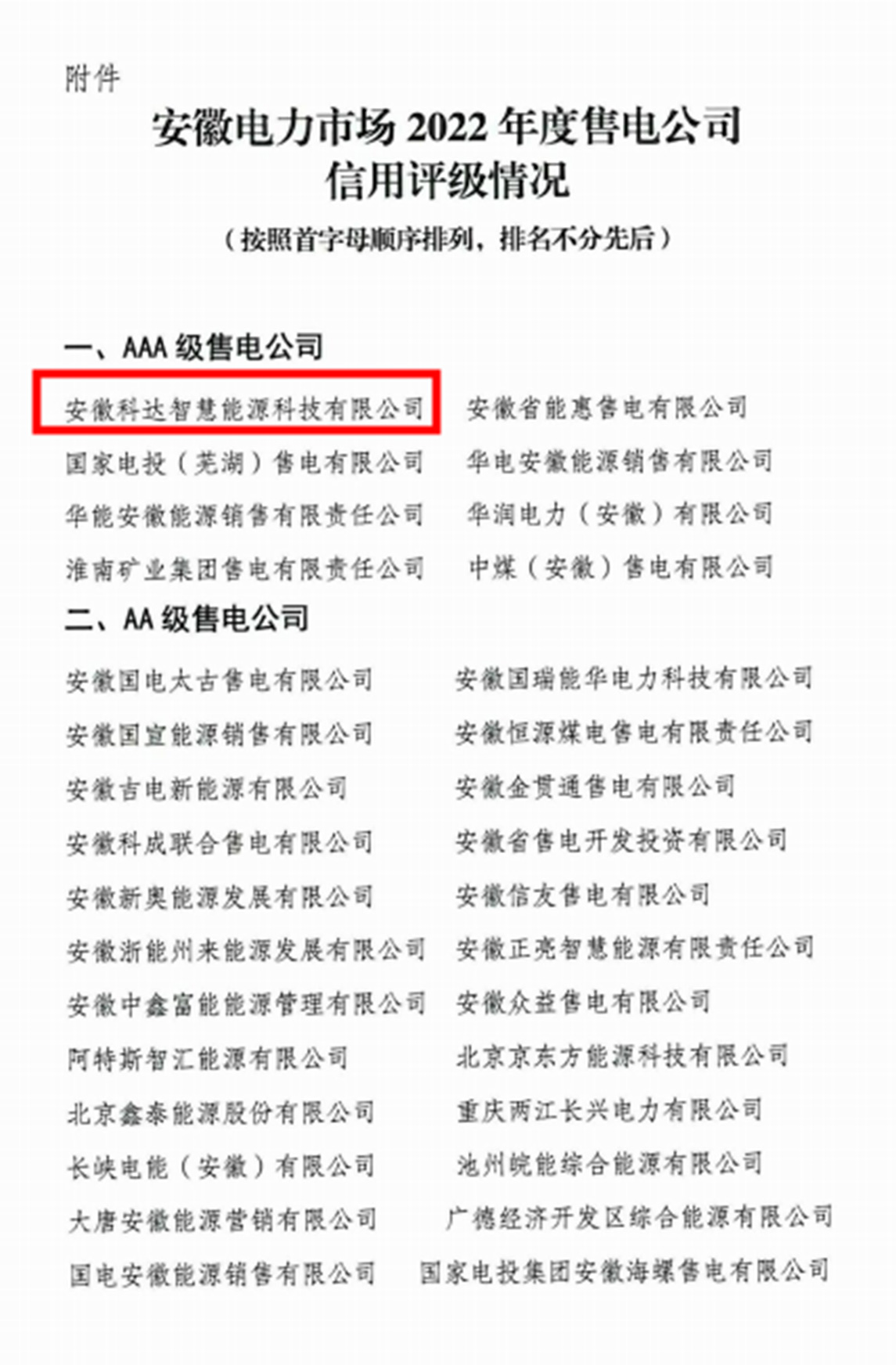 早在2023年4月23日,安徽電力交易中心發(fā)布《關于安徽電力市場2022年度售電公司信用評價結果的通知》,科達智慧能源榮獲2022年度安徽售電信用評價AAA級售電公司,標志著科達智慧能源進入安徽省內售電服務領域第一梯隊。