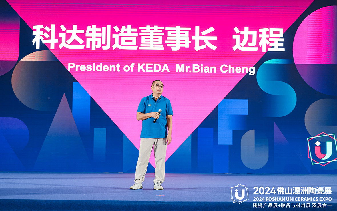 我要講的第二句話就是合作。我們愿意跟所有的陶瓷機械同行合作,我們絕不想跟他們競爭。我們目前在佛山市兩區四鎮有八個工廠,總建筑面積100萬平方米,也就是一平方公里,我們這三年投入了接近20個億,進行全面的升級改造。我們都知道中國的鋼材是4000(元)一噸,(鋼材是)陶瓷機械的主要成本,美日歐的鋼材是1萬(元)一噸,我們完全有理由相信,用科達的生產基地為意大利的同行,包括國內的同行,可以做出更好性價比的機械產品來,我們希望跟同行們全面合作。