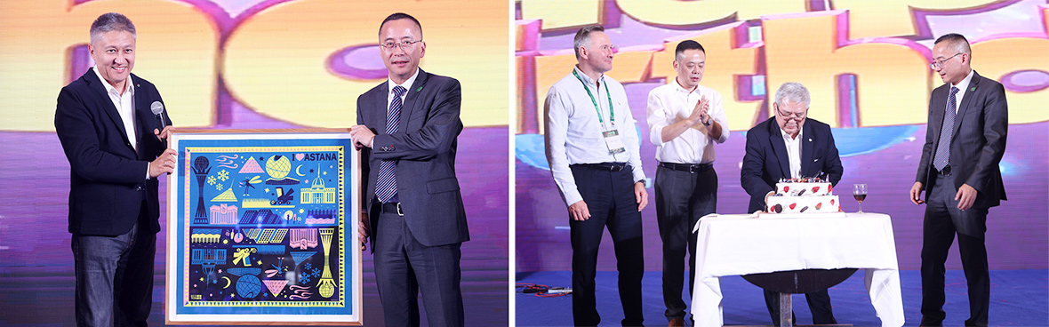晚宴上,中國加氣混凝土協會會長沈曉鶴、歐洲加氣協會主席 Mr.Robert Turski、安徽科達機電董事長陳新疆分別作致辭和祝酒詞,共同表達了對全球AAC行業同仁共聚西安的激動和感激之情。此外,晚宴當晚恰逢哈薩克斯坦AAC協會會長Sukurov Nurbolat生日,安徽科達機電特地精心準備了生日蛋糕并邀請與會人員共同慶祝。同時,Ecoton集團公司負責人Baurzhan Baymukhanov在晚宴現場給安徽科達機電贈送了一份誠意滿滿的禮物,以表對雙方深厚友誼的珍視和對未來合作的美好祝愿。