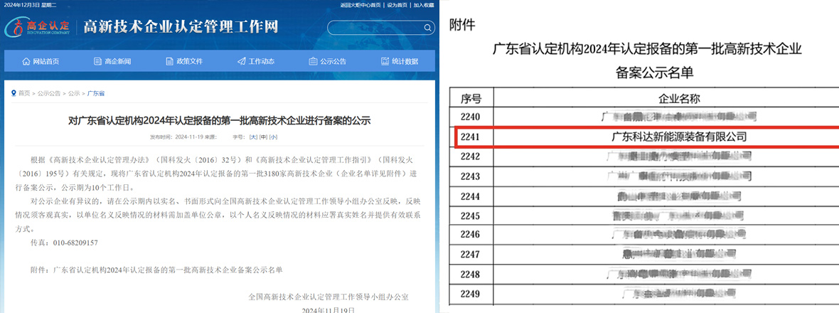 近日,廣東科達新能源裝備憑借在人才隊伍建設、技術創新、企業管理等方面的優秀表現順利通過認定,榮獲廣東省“高新技術企業”稱號。