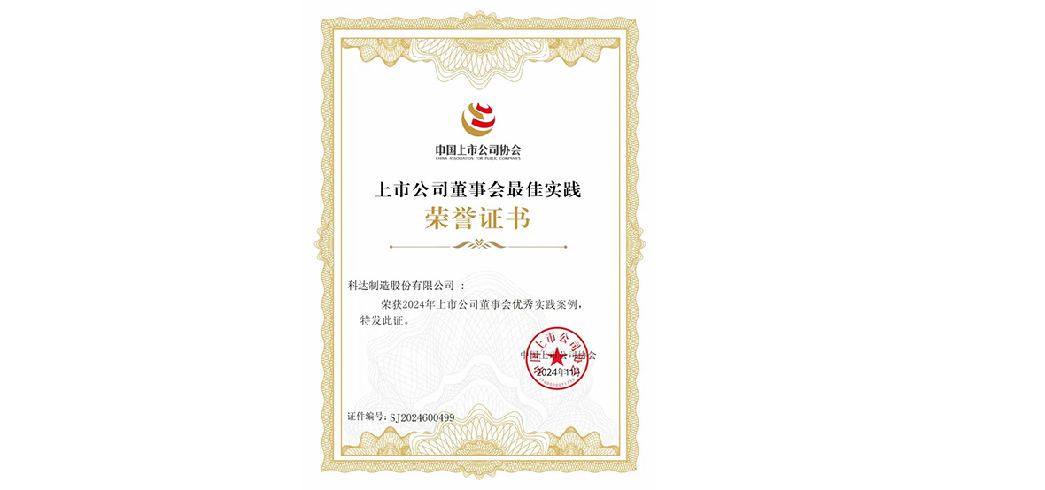 近日,中國上市公司協會主辦的“2024上市公司董事會最佳實踐案例”評選結果正式揭曉,科達制造憑借優異的公司治理表現及高效合規的董事會運作機制成功入選“2024年上市公司董事會優秀實踐案例”。