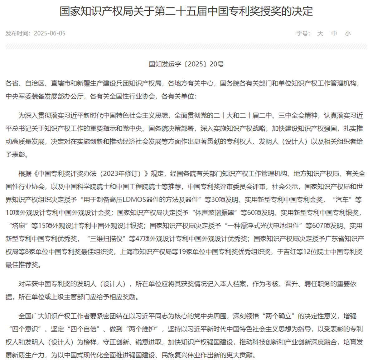 6月5日,國家知識產權局公布第二十五屆中國專利、中國外觀設計金獎、銀獎及優秀獎獲獎名單。
