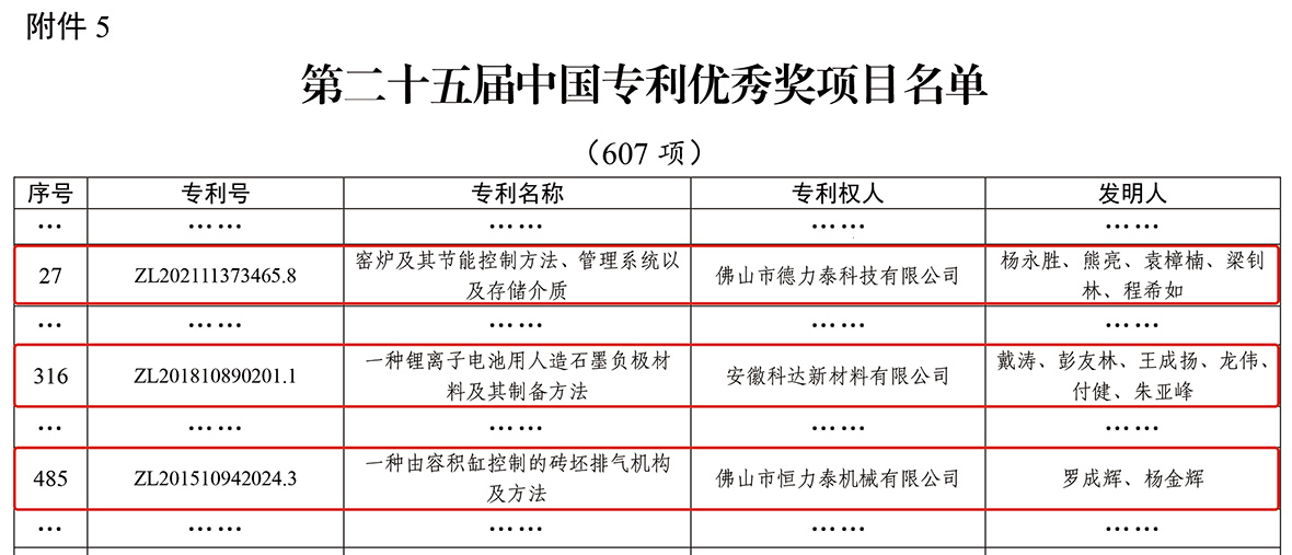其中,恒力泰機械的《一種由容積缸控制的磚坯排氣機構及方法》、德力泰科技的《窯爐及其節能控制方法、管理系統以及存儲介質》、安徽新材料的《一種鋰離子電池用人造石墨負極材料及其制備方法》獲第二十五屆中國專利優秀獎。