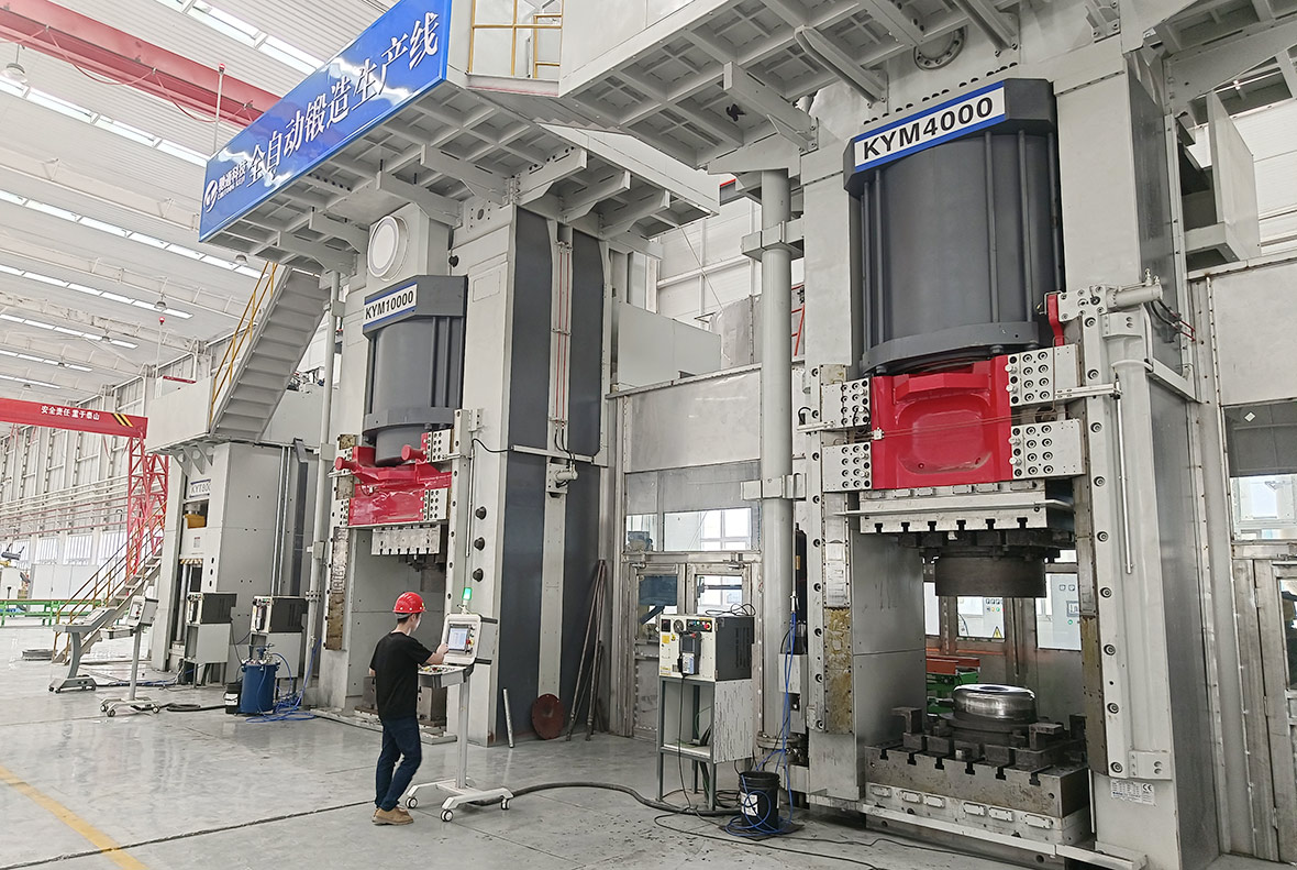 該條全自動(dòng)鍛造生產(chǎn)線引入了3臺(tái)科達(dá)壓機(jī),分別為預(yù)鍛部分的KYM4000鍛造壓機(jī)、成型鍛KYM10000鍛造壓機(jī)以及沖擴(kuò)孔KYM800噸壓機(jī)。