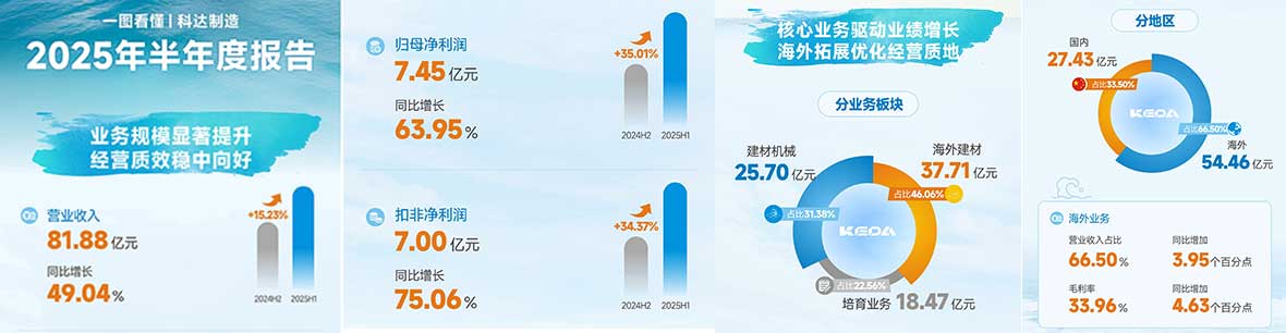 8月25日晚間,公司發布2025年半年度報告。報告顯示,2025年上半年科達制造實現營收81.88億元,同比增長49.04%,創歷史同期新高,其中海外收入占比超65%,較去年同期進一步提升;歸母凈利潤為7.45億元,同比增長63.95%。