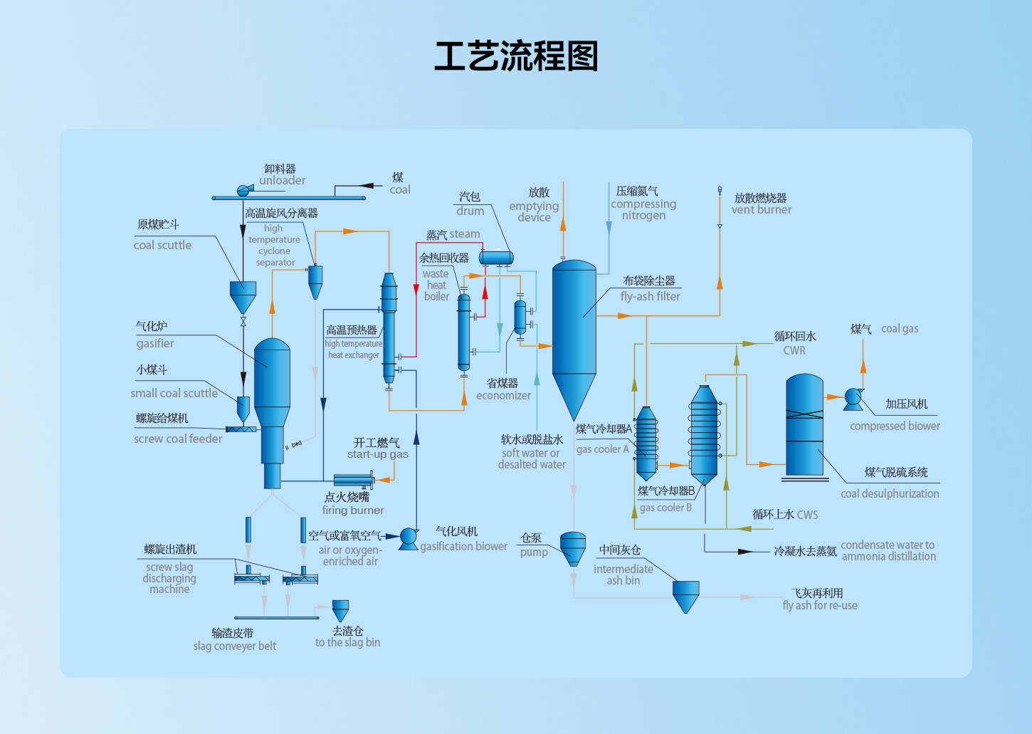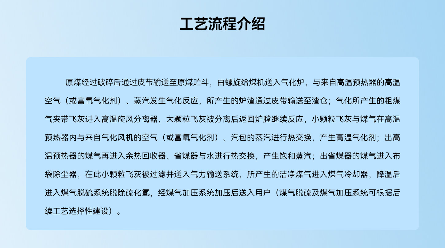 ● 清潔:生產過程無三廢排放,煤氣中H2S含量≤20mg/Nm3,粉塵含量≤10mg/Nm3,煤 氣清潔程度達二類天然氣標準。 ● 高效:采用全逆流換熱可回收90%以上煤氣顯熱;高溫助燃技術可顯著提高煤氣熱值。 ● 產能高:單爐產氣量可達80kNm3/h,可調負荷范圍廣。 ● 運行成本低:使用碎煤,不必采用昂貴的塊煤,顯著降低制氣成本。 ● 運行安全穩定:完善的安全保護連鎖、一鍵停車設置;關鍵設備可在線更換維修,單爐最長運行周期超過12個月。