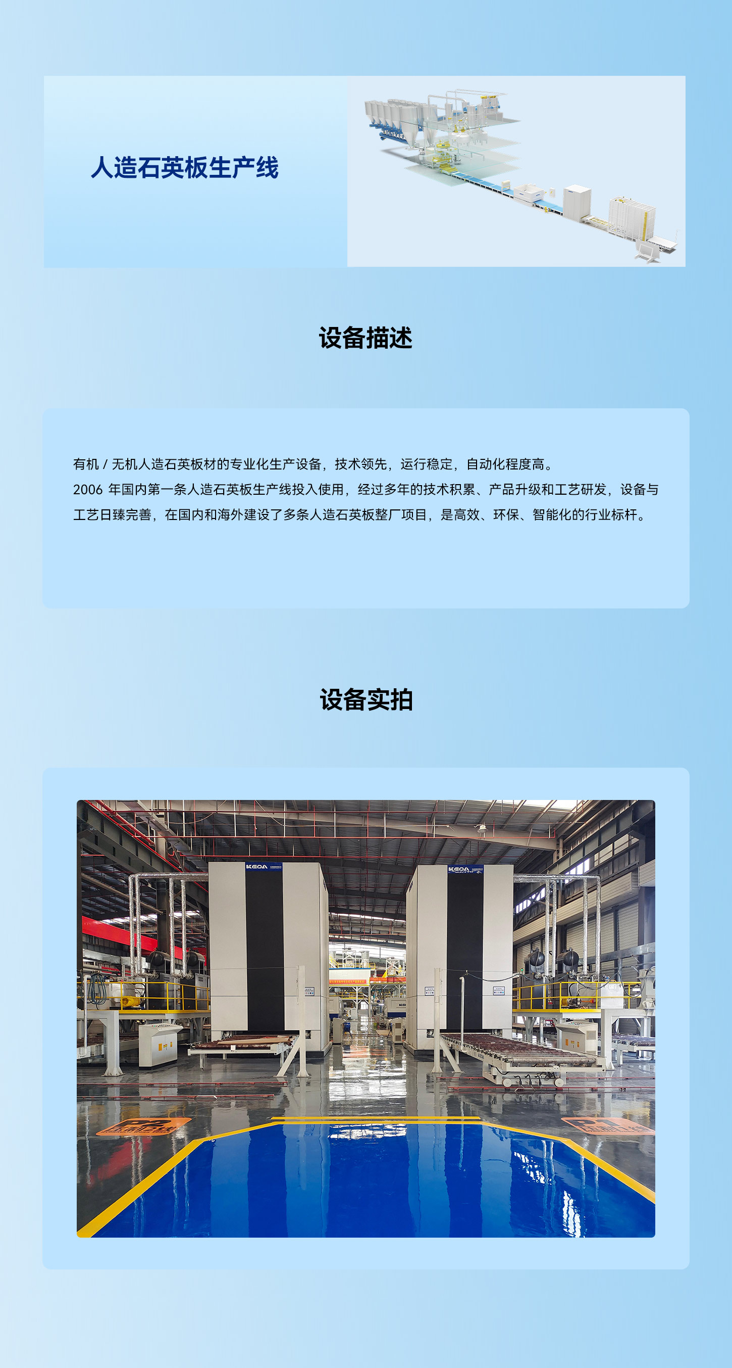 有機(jī) / 無(wú)機(jī)人造石英板材的專業(yè)化生產(chǎn)設(shè)備,技術(shù)領(lǐng)先,運(yùn)行穩(wěn)定,自動(dòng)化程度高。2006 年國(guó)內(nèi)第一條人造石英板生產(chǎn)線投入使用,經(jīng)過多年的技術(shù)積累、產(chǎn)品升級(jí)和工藝研發(fā),設(shè)備與工藝日臻完善,在國(guó)內(nèi)和海外建設(shè)了多條人造石英板整廠項(xiàng)目,是高效、環(huán)保、智能化的行業(yè)標(biāo)桿。