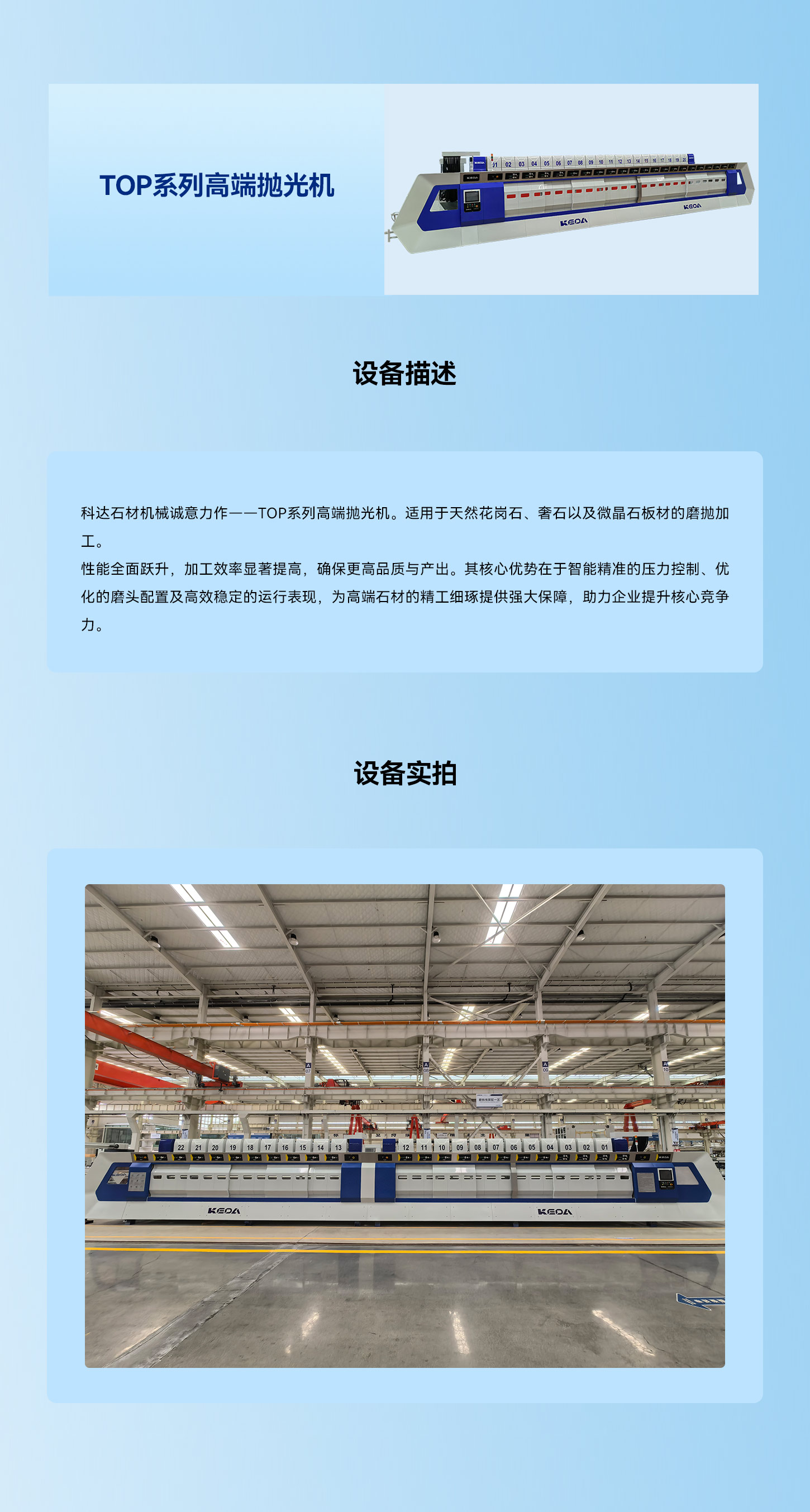 科達石材機械誠意力作——TOP系列高端拋光機。適用于天然花崗石、奢石以及微晶石板材的磨拋加工。